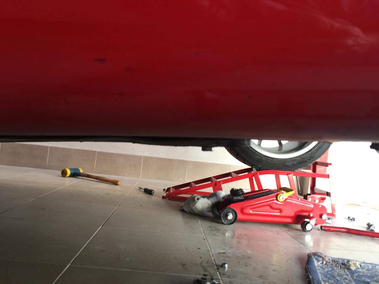 Para solucionar este entuerto y no sea un engorro subir el coche al elevador, me fabriqué dos suplementos para poder apoyar los brazos sin tener que quitar el fondo plano... La cabeza del tornillo queda embutida dentro del suplemento y este apoya en la fondo plano,