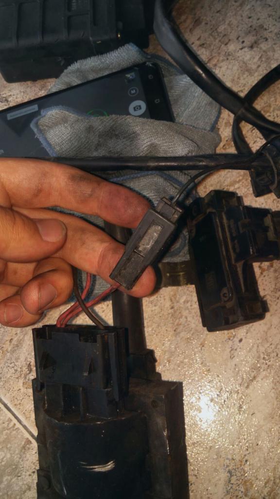 En el lado "izquierdo" se ven los conectores que no se han salido y lo que creemos que es un negativo (está marcado como "|"), al cual mi amigo le ha conectado el cable marrón: