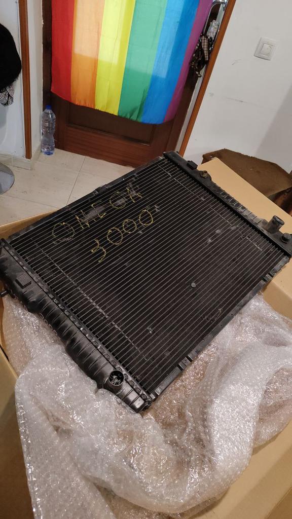 Resultaría ser que las primeras unidades de Omega 3000 carecían de enfriador de aceite, por lo tanto montaban un radiador con anclajes distintos y no incorporan anclajes para el radiador de aceite, que va posicionado al lateral del de refrigerante en versiones posteriores. Mi gozo, en un pozo. Pero bueno, no todo esta perdido, al menos por el mismo precio del radiador el desguace me mandó el manguito superior, y ese al menos es valido una pieza menos en el puzle!