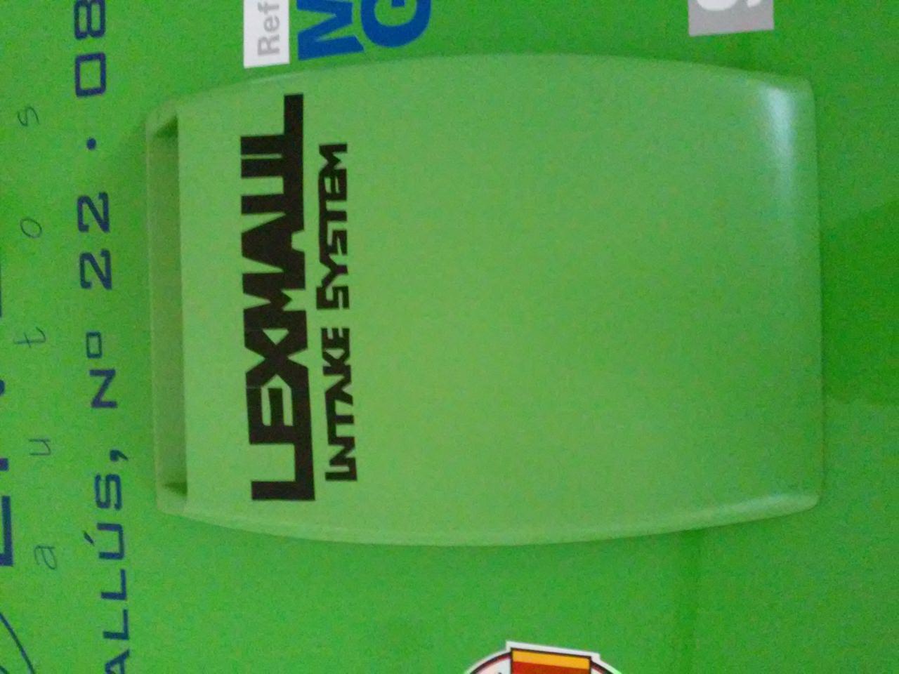 Filtro de sustitución deportivo, puesto en la caja original, pero con el tubo de admisión de 10cm de diámetro puesto directamente al hueco del antiniebla delantero con toma de aire mediante campana artesanal de fibra de vídrio.