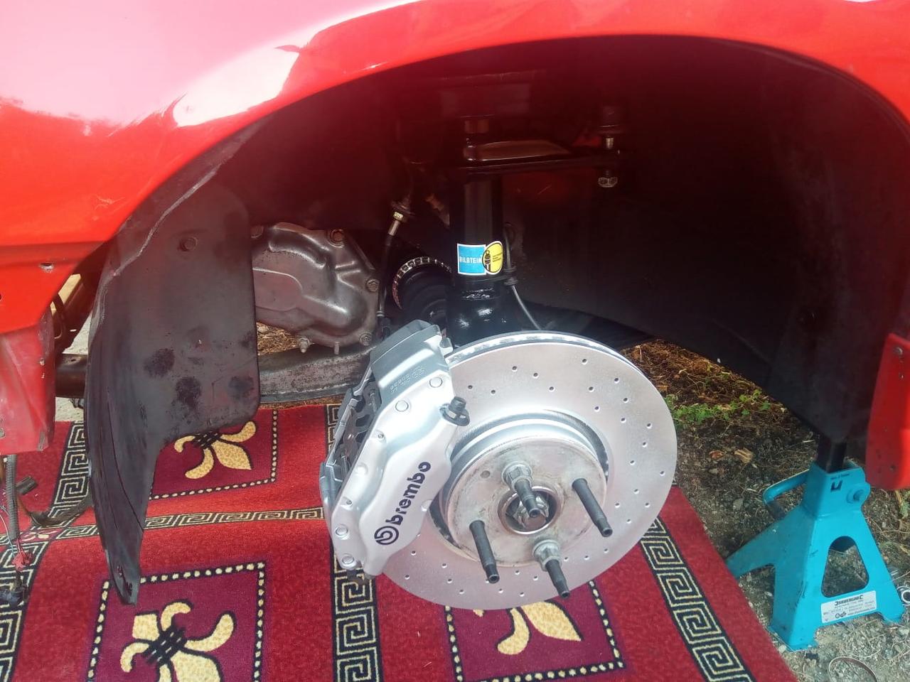 Ya aproveché para pintar las pinzas en grises,y los discos...trapecios nuevos SKF,manguetas limpias,cuna de saab,logo de turbo.