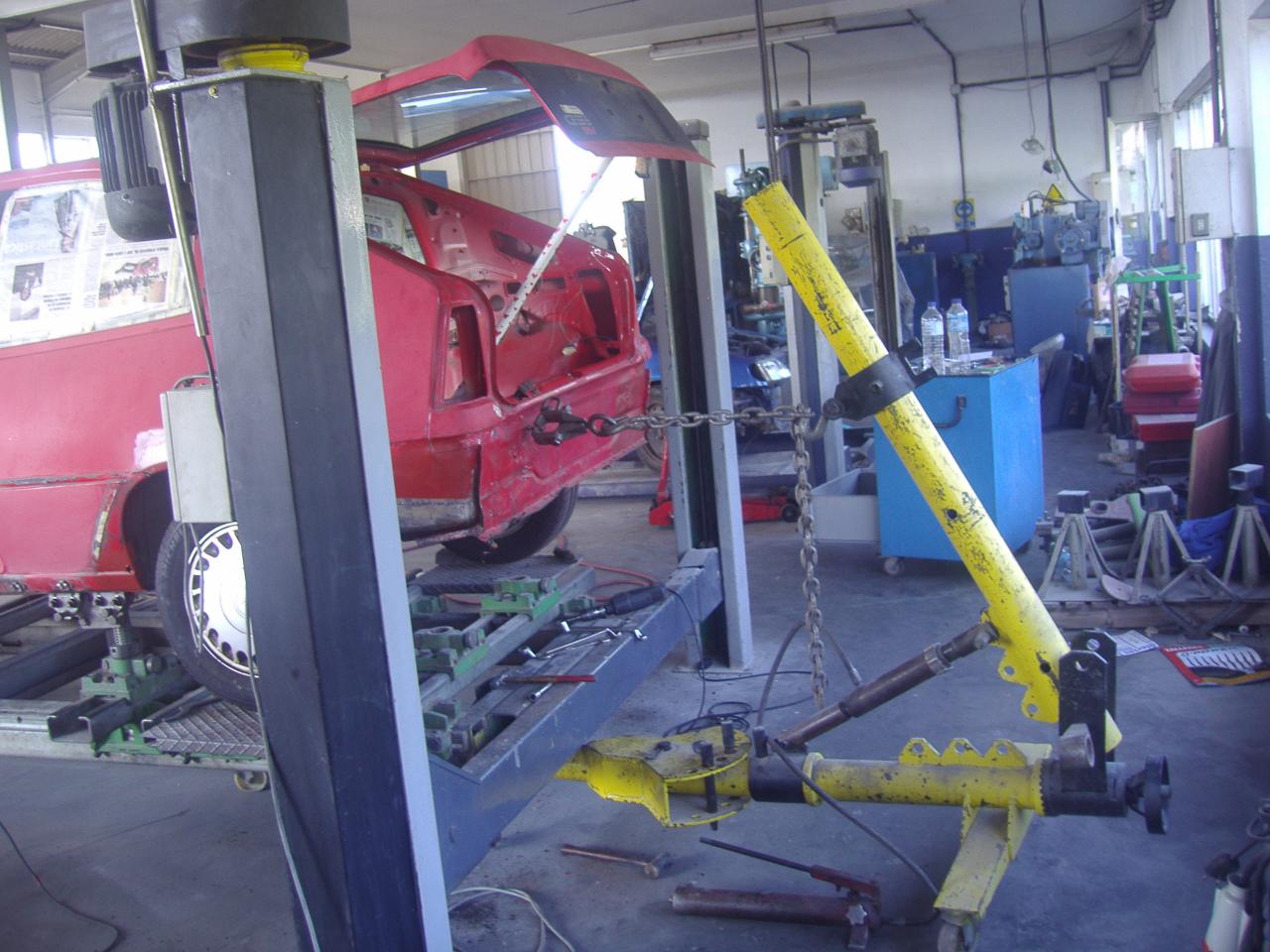 Sigo, pasamos a la sección de chapa, pero antes de sanear los podridos, tocaba "estirar" el coche, dónde más trabajo había era en la parte posterior, y nos llevó unas cuántas horas volver la chapa a su sitio. En la parte delantera apenas había trabajo, simplemente tuvimos que tirar un poco del travesaño central del frente, ya que tenía una pequeña arruga.