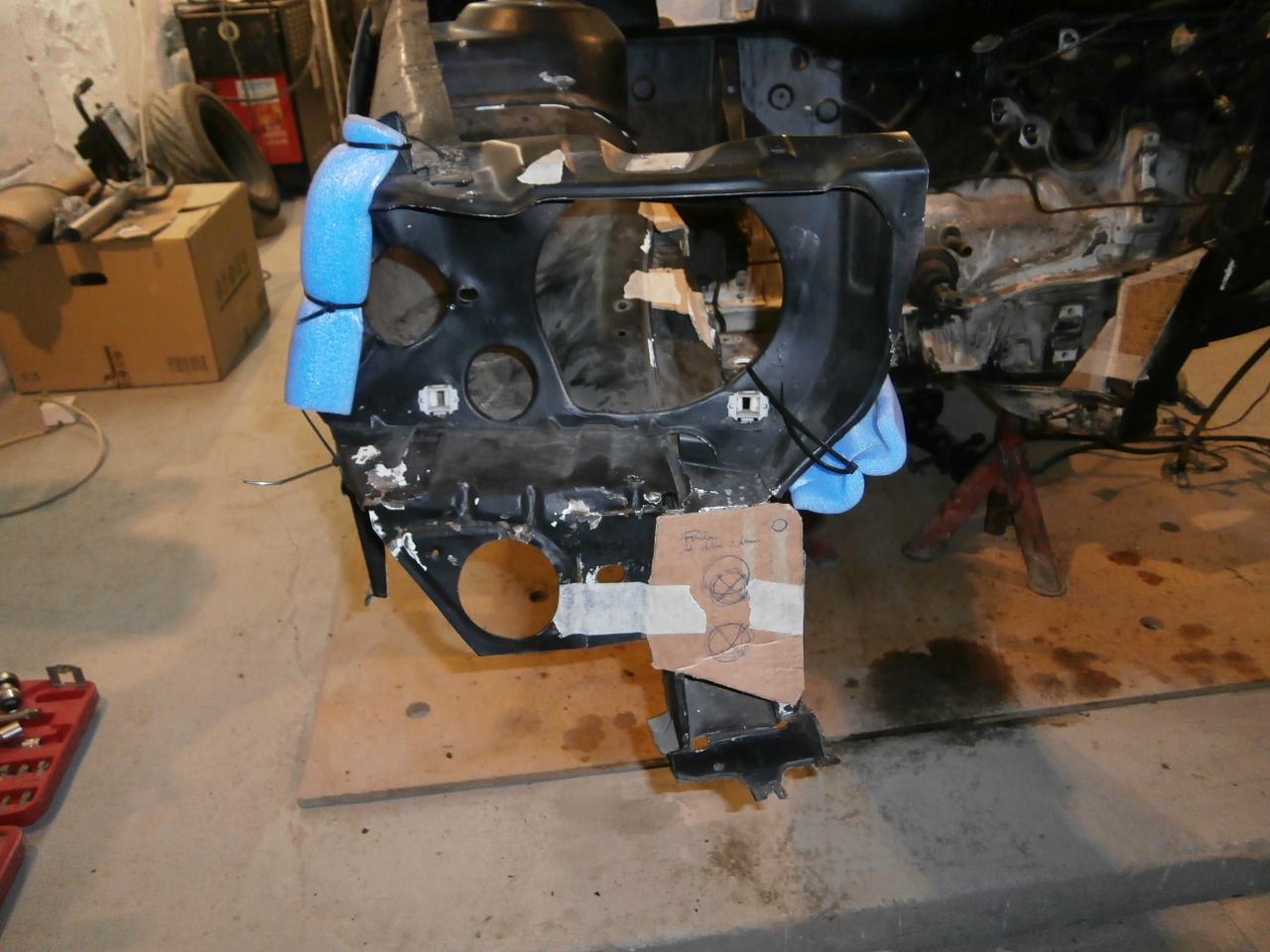 Bueno, pues nada, hoy tocó volver a sacar motor fuera (5 minutos xD, maravilloso esto de no tener el frontal), desmontar 4 cosas que me estorbaban, como lineas de freno, trapecios, y sacar un poco de roña que tenía acumulada, y hacer plantillas para los refuerzos que después haré con chapa, que ya me traje el otro día. Encargué 2 planchas de medio metro cuadrado de 2 y 3 mm de espesor (aunque esta de 3 mm me da que la usaré poco, tengo que comprar más de la de 1 mm, que tengo poco stock).