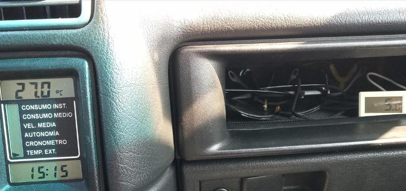 Volviendo al sistema del AA, hoy al salir del curro esto ha empezado a enfriar a toda velocidad. Aquí en el sur andábamos a las 7 de la mañana en unos 20°C, y a las 3 de la tarde marcando 27°, así que sigo usando el aire.