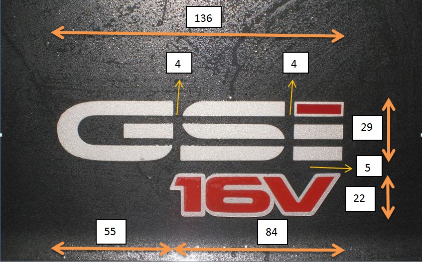Y por partes, las letras GSI tienen idénticas medidas que las letras de las aletas delanteras y luego el 16V mide 84 de largo por 22 de alto y está separado 5mm de las letras GSI.