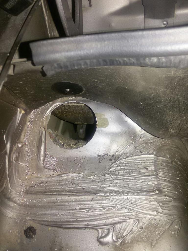 Por suerte, el punto a taladrar venía marcado en el coche y no hubo problema en agujerear usando una corona de 54mm