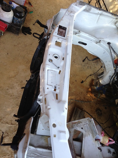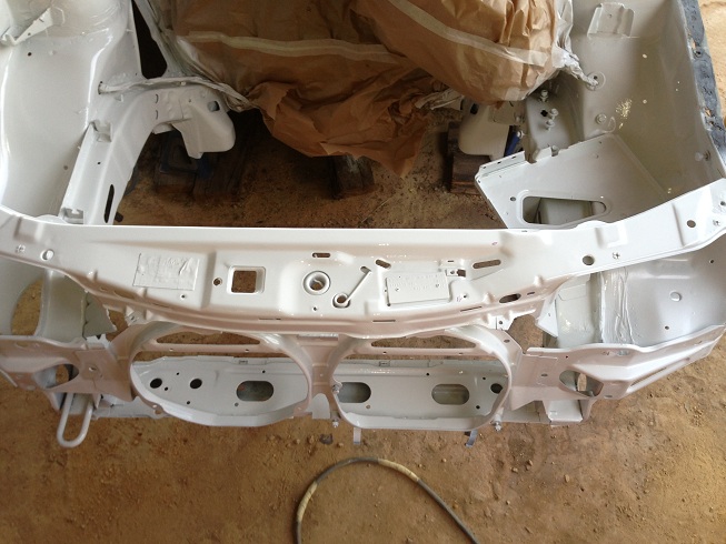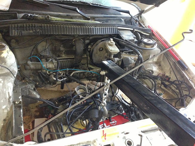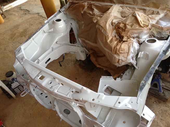 Desmonte el frontal , aletas , paragolpes y demas y saque el motor con toda la mecanica , para petrolear , lijar y pintar el vano motor.