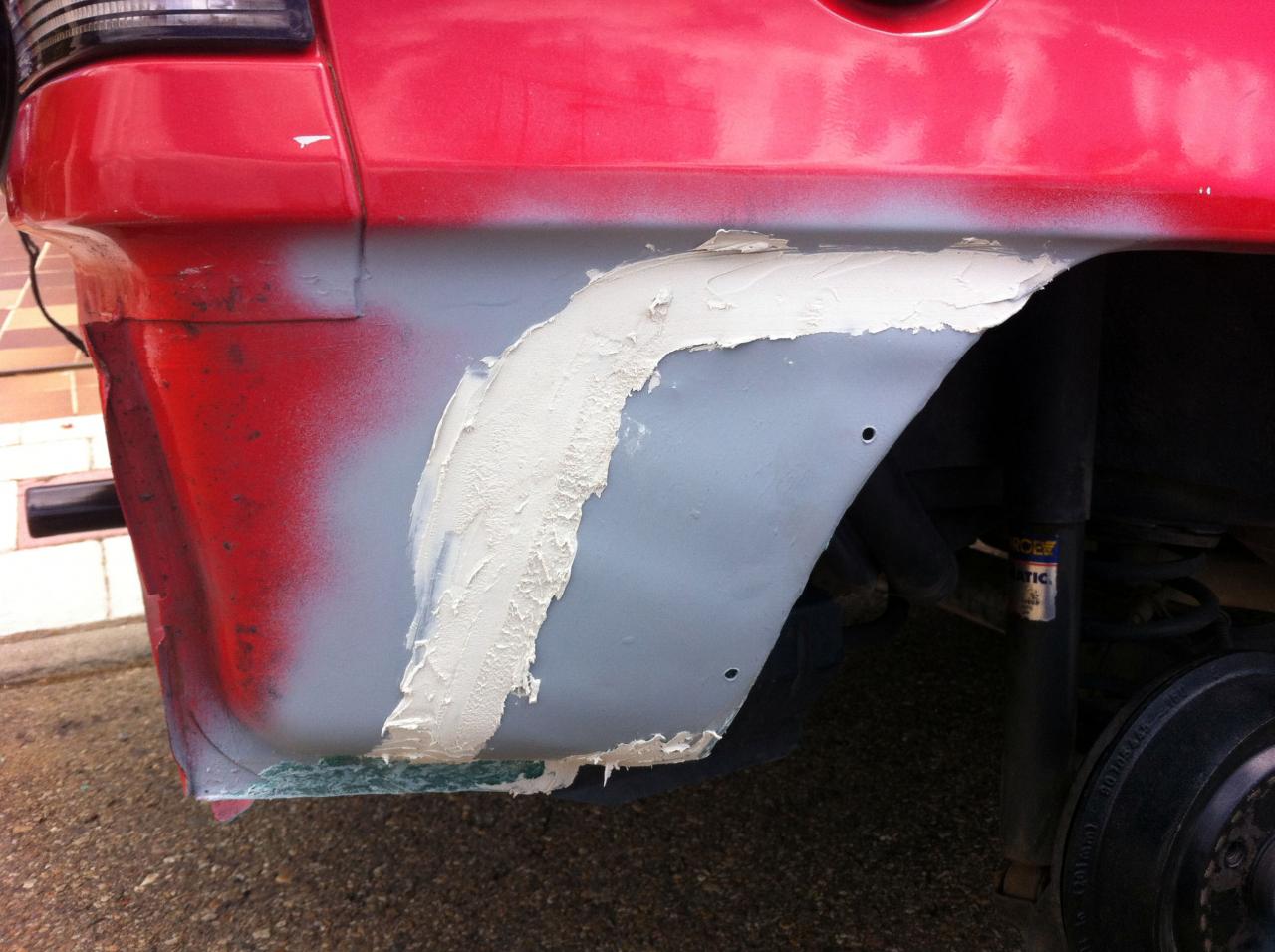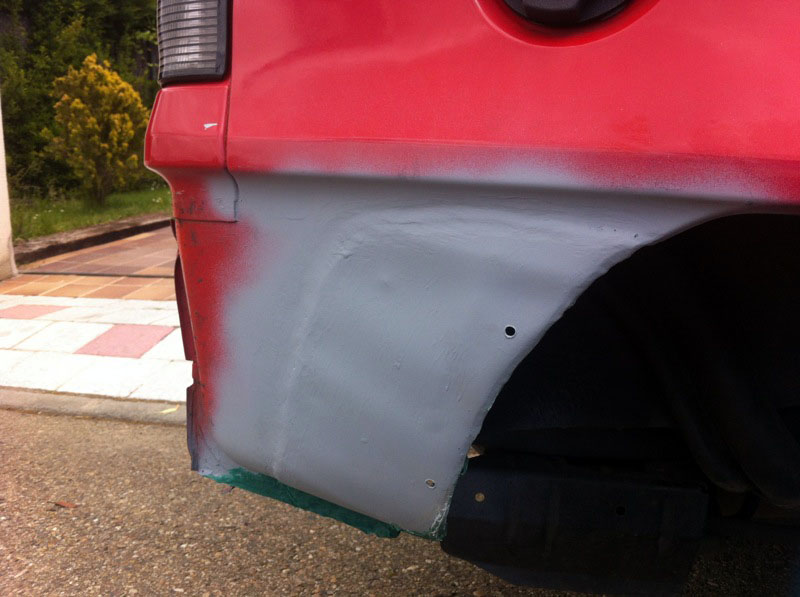 2.Las aletas traseras estaban oxidadas en la parte que tapa el parachoques, asique en la izquierda, que solo tenia un poco de oxido, lo lije bien, di convertioxido, aparejo y pinte:
