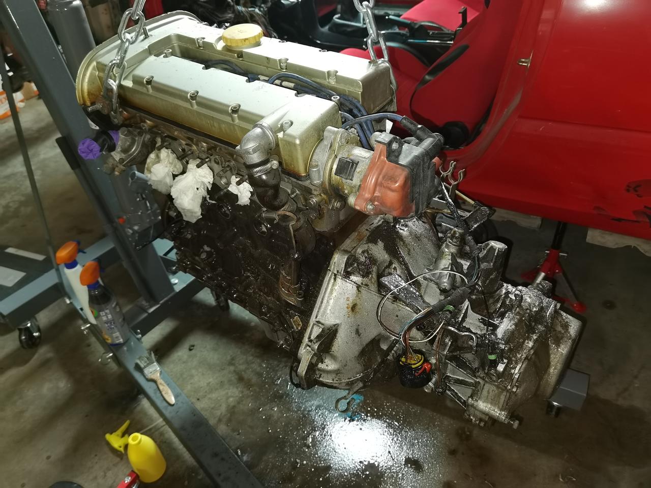 Y aqui una foto de lo ultimo que he hecho, hable con mi amigo mecanico (el que me regalo el coche) y me dijo que ya puestos a ponerlo al dia, lo abriamos y cambiabamos casquillos de biela y demas, asique me compre una grua y con paciencia y preguntando por whatsapp a mi amigo, he conseguido sacarlo en mi cochera jejeje