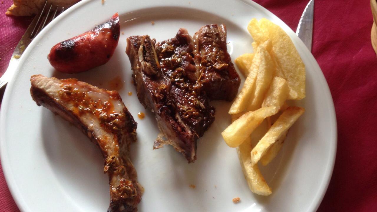 - Churrasco de cerdo y ternera con chorizos criollos, ensalada y patatas fritas