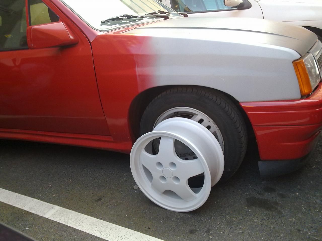 Todavia pasó un tiempo hasta que se le calzaron estas llantas, ya que no teníamos gomas para él, así que se tiró tiempo con las 14, hasta que un cambalache entre las del kadett y unas de desguace que me consiguió Carlos, (Gracias Carletes) y se le pudieron poner, la verdad que le quedan muy bien para mi gusto, y a día de hoy, la pintura está como el primer día, y eso que compré un kilo por 8 euros, y hay para pintar 20 o 30 llantas...gracias titanlux, jajajajaja.
