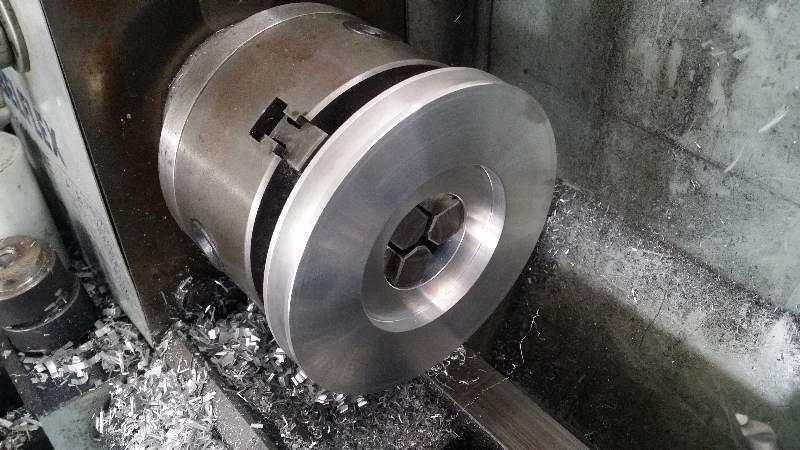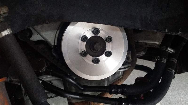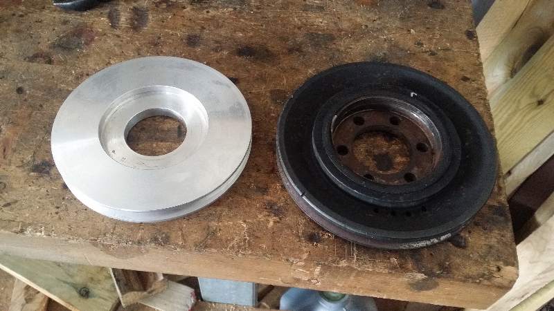 Polea de aluminio casera, unos 340gr de peso frente a los 1800 o asi que pesa la doble original, un ahorro de peso notable