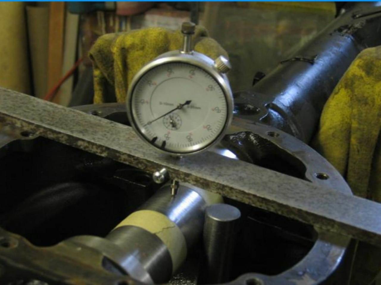 Luego de tener el eje apretado pide fijar el primer útil, que es un carrete mecanizado, en la posición donde iría el diferencial y colocar el otro útil que es una barra calibrada encima del piñón de atque. Luego con un comparador se mide la diferencia de altura entre ambos, que nos dará el espesor de forros necesario a meter detrás del rodamiento principal del piñón del ataque.