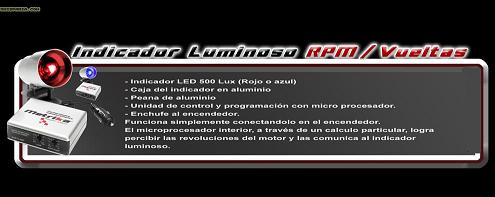 INDICADOR LED 500 LUZ ROJA,CAJA INDICADOR ALUMINIO,PEANA DE ALUMINIO,UNIDAD DE CONTROL Y PROGRAMACION CON MICROPROCESADOR,ENCHUFE AL ENCENDEDOR,EL MICORPROCESADOR INTERIOR,A TRAVES DE UN CALCULO PARTICULAR LOGRA PERCIBIR LAS REVOLUCIONES DEL MOTOR Y LAS COMUNICA AL INDICADOR LUMINOSO,FACIL INSTALACION SOLO CONECTANDOLO EN EL ENCENDEDOR.