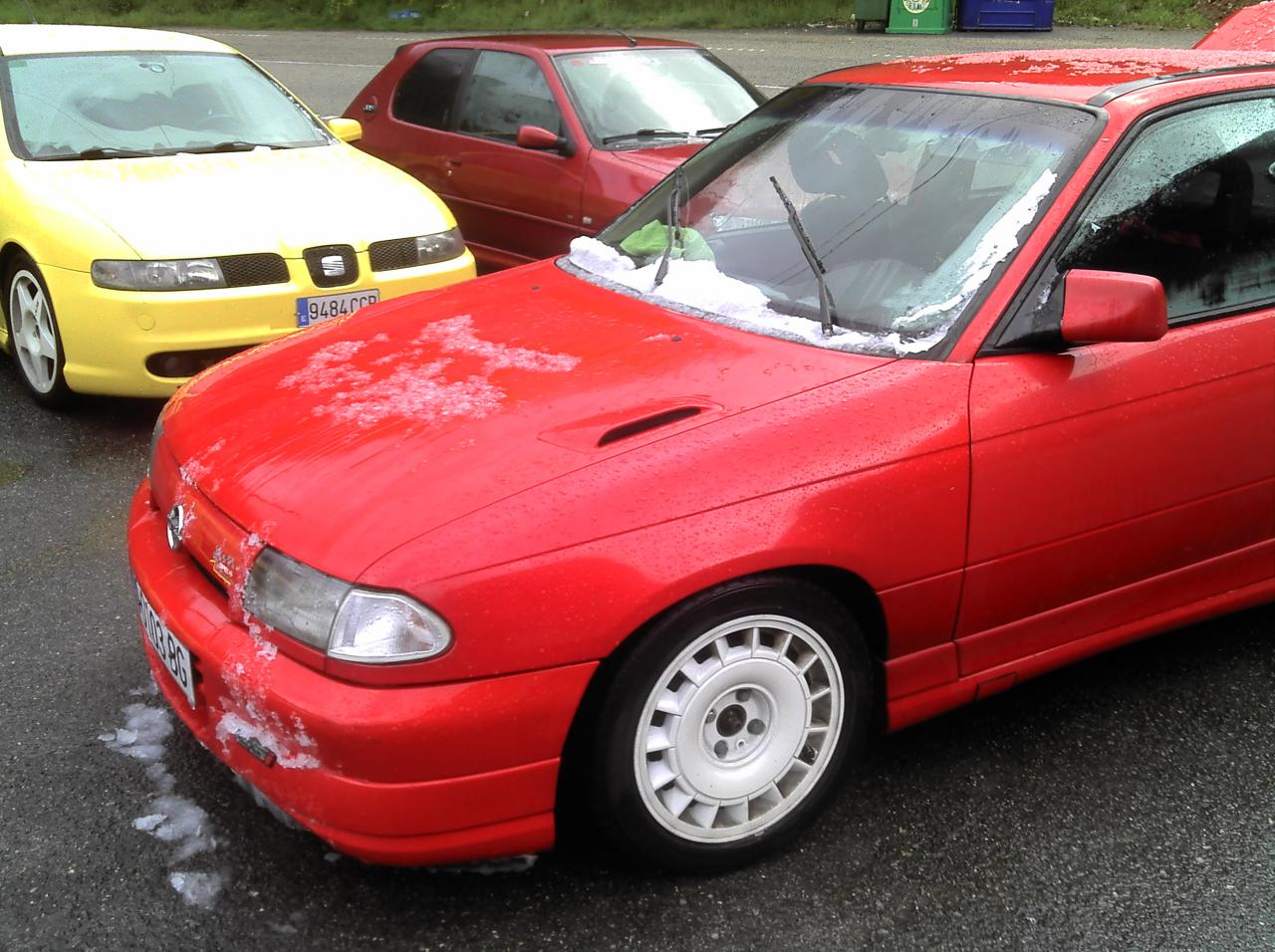 en enero tuve un pequeño percance, le endiñe no muy fuerte a una scenic por detras en un ceda. típico q parece q el tio pasa y tu miras para pasar después y cuando te das cuenta el tipo clavo el freno porque le apetecio... el caso es que el frente se doblo y el capo y rompieron los faros. no fue mucho pero ya no pasaria la itv sin una reparación un poco seria de chapa. un mes antes había pillado un astra 16v para reparar de culata (ya le hago otro post luego xD) y poco mas, muy barato asi que ya lo vi claro. tenia todo listo desde el verano para calzarle un saab b204l al rojo jejeje