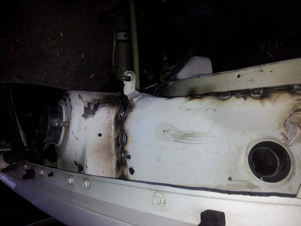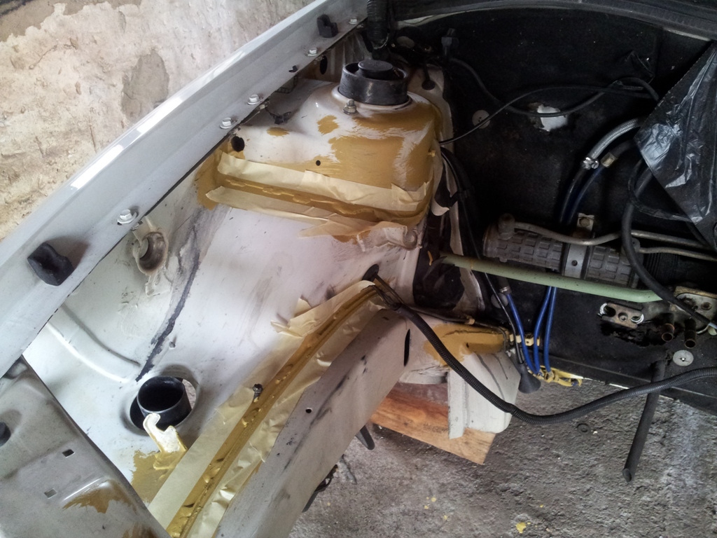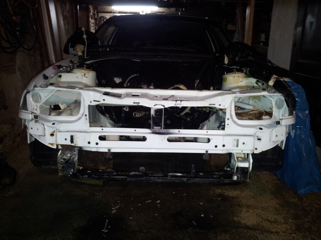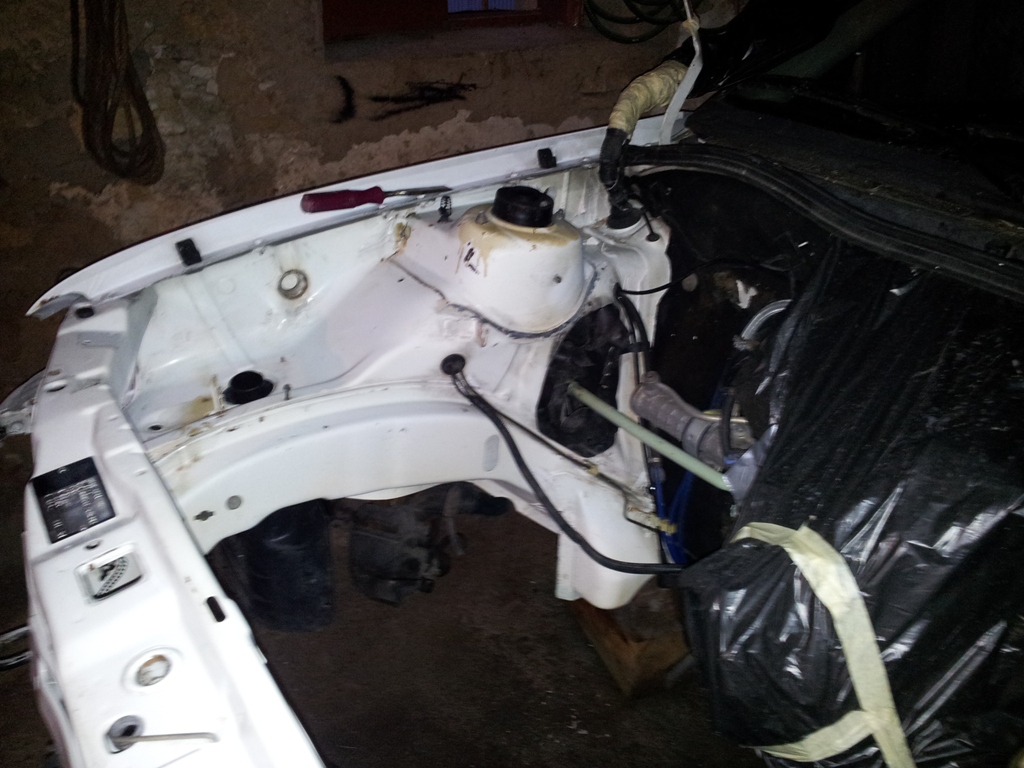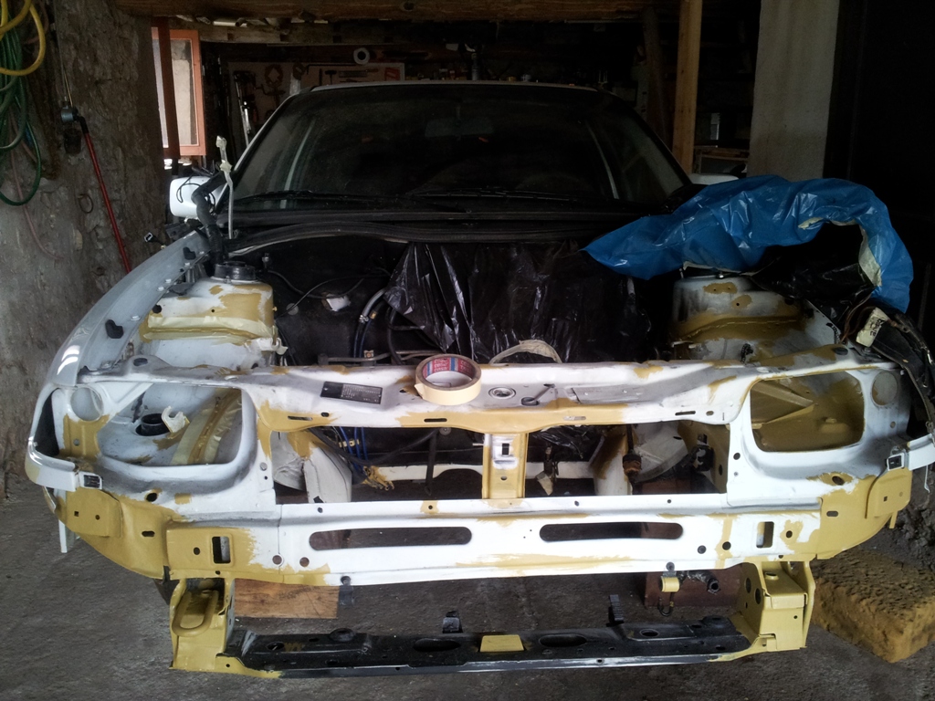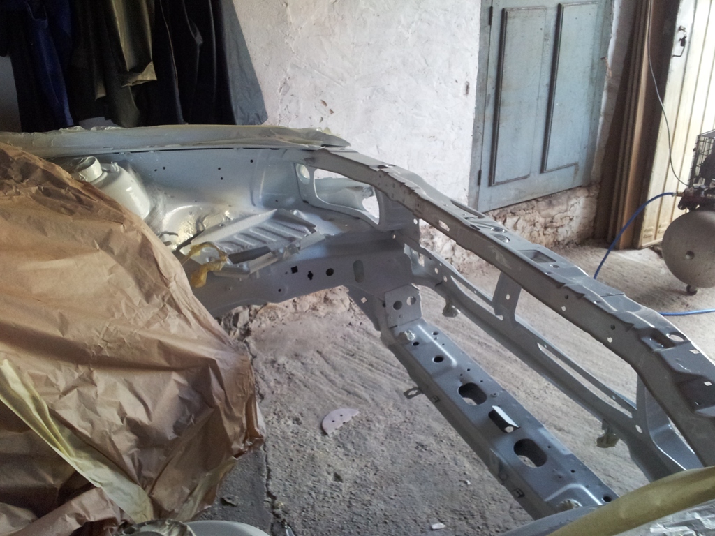 Bien... lo primero como era lógico fue desarmar...quitar defensa , faros, radiadores...etc , para poder sacar el motor del astra y ponernos con el vano del coche , a fin de resoldar y pintar antes de su nuevo motor.