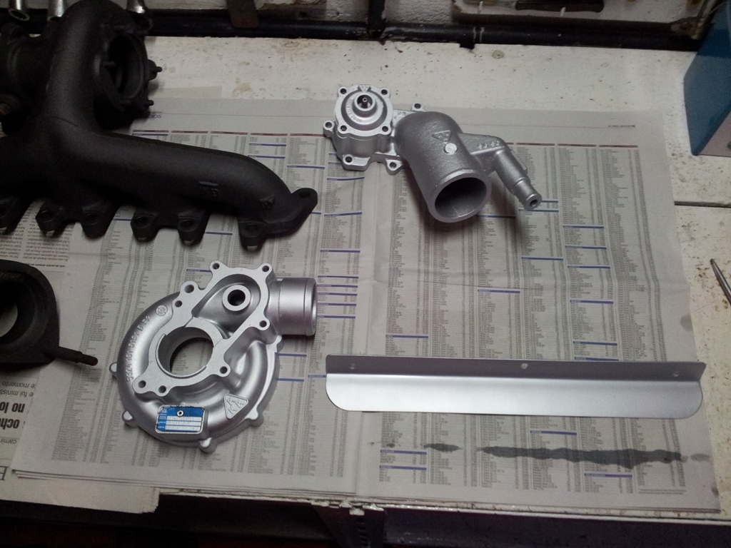 Mientras tanto van llegando cosas...tuberías para el intercooler , distribución completa con bomba de agua , la bomba de dirección nueva , correas de acesorios , trapecios,rotulas y demás también nuevos , termostato fresquito , amortiguadores y muelles , vamos un poco de todo..