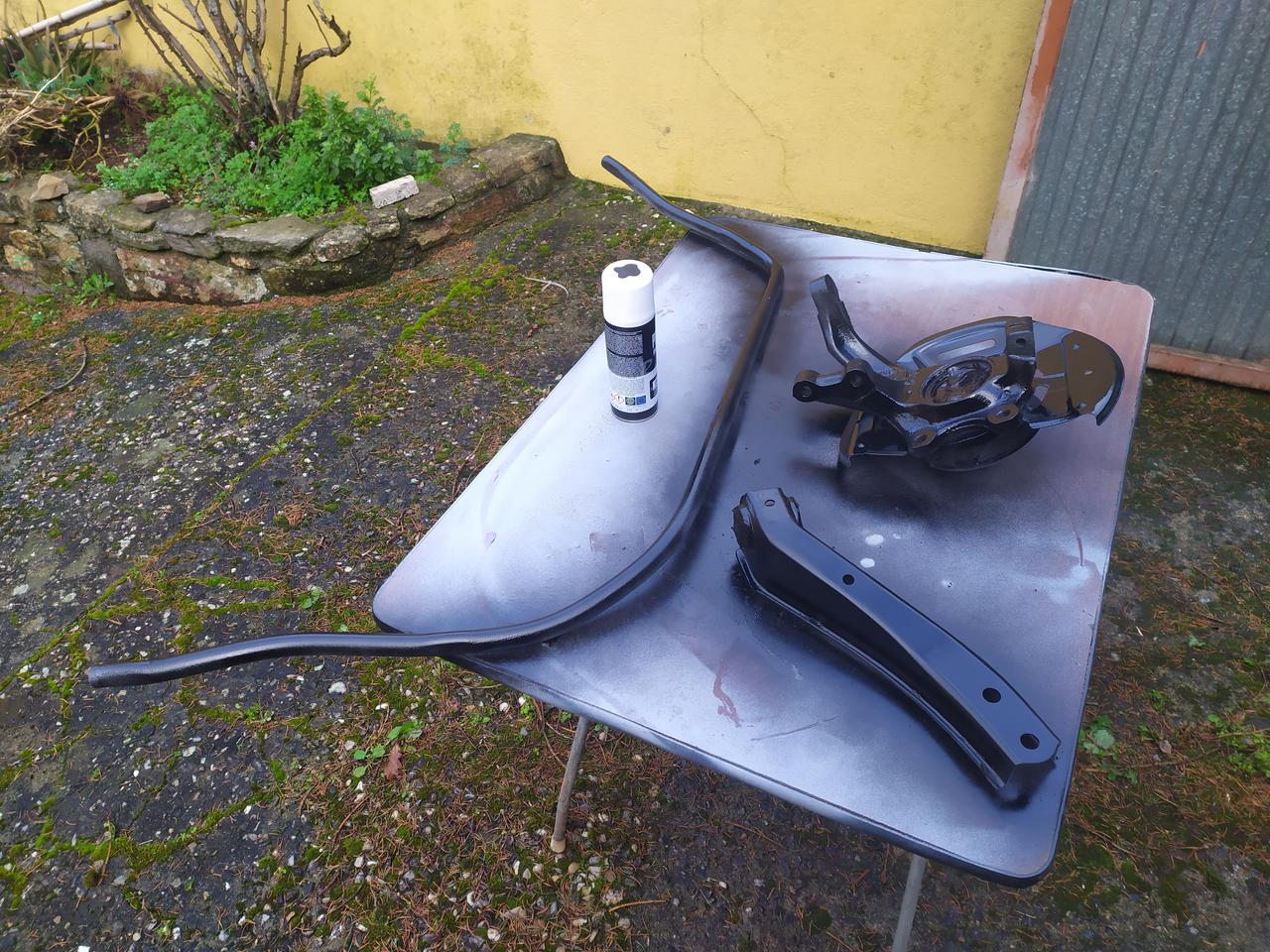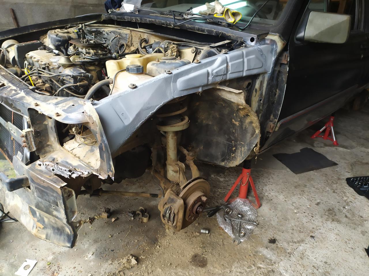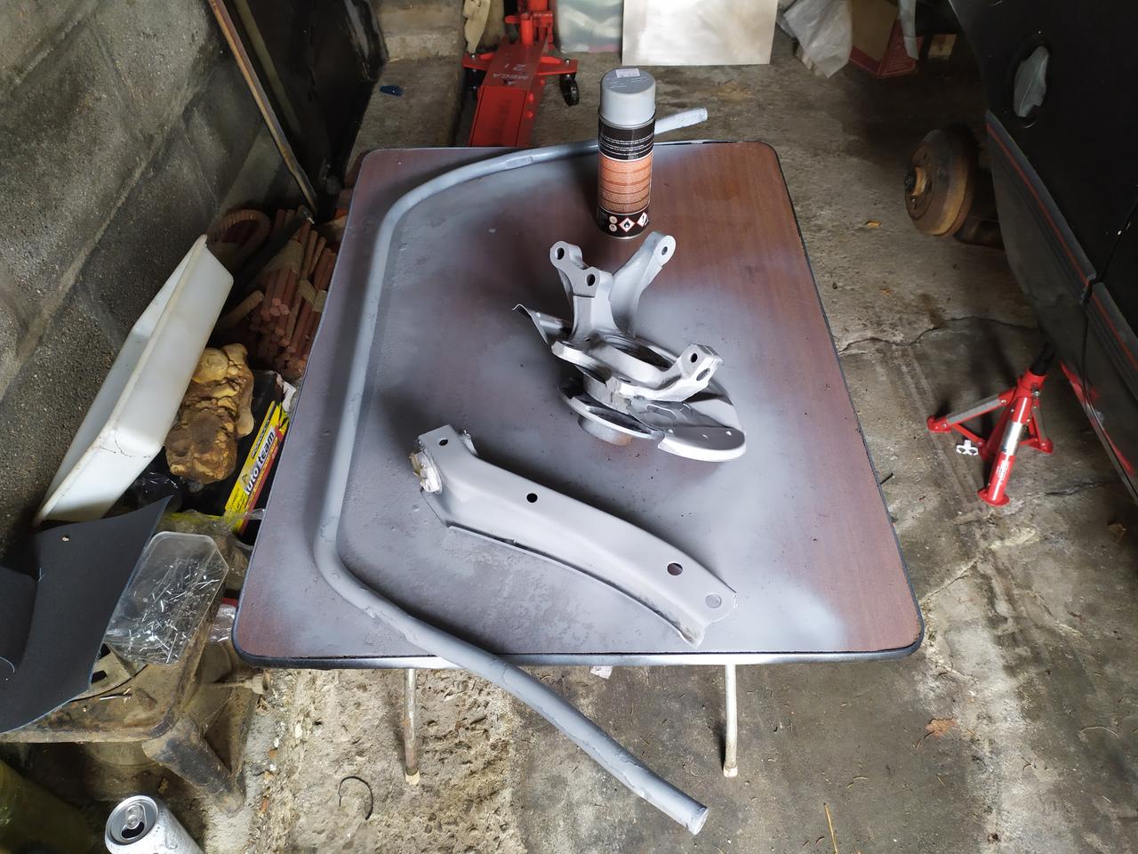 Hoy, primer dia de trabajo, sacamos una aleta y defensa que tenian un golpe, barra estabilizadora, mangueta y trapecios para lijar y pintar.