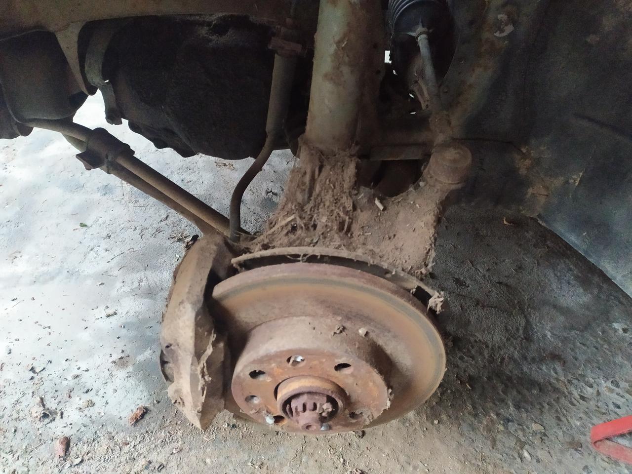 Al dia siguiente, desmontando los frenos del lado del piloto, en efecto vimos que de un lado estaba el hierro, por lo que presupongo que me dijo la verdad y no fue haciendo el cabra. Así que esa fue la historia de la aleta