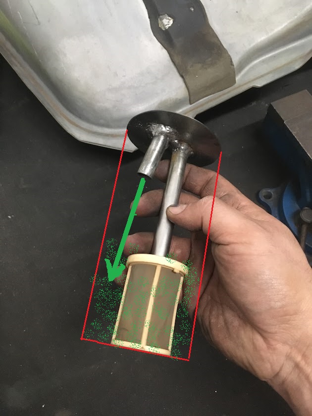 Así las cosas, intenté ver qué podía hacer con el depósito original. Conservo el aforador original, que vale dos duros, y marca nivel correctamente (el de GSI NO marca bien). Hay que implementar un "swirl pot", alias piscina interna, para que no descebe en curvas. Se me ocurrió "injertar" un vaso interno que tenga perforaciones en su parte superior que permitan rebosar con facilidad, y en su parte inferior que permitan que se vacíe poco a poco en caso de curvas/frenadas, y a su vez equilibre el nivel con el del depósito. Atendiendo a los medios de que dispongo, y dado que no quería hacerle un agujero enorme al depósito, le hice el invento con una corona de 63mm y tubo, tal que así: